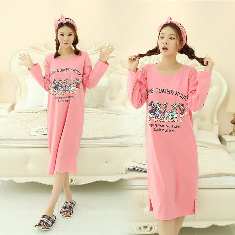 韩版睡裙女秋 纯棉宽松大码女士睡衣唐老鸭长款长袖中长裙连衣裙