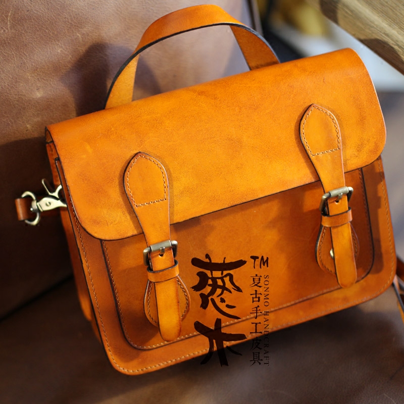 进口头层手工水染植鞣牛皮邮差包,单肩斜跨手提三用,经典剑桥包外观,翻盖磁扣设计,做工精良,里外全皮,结实耐用,染色植鞣牛皮随着使用,皮质会越来越有光泽,赠运费险,终身保修。